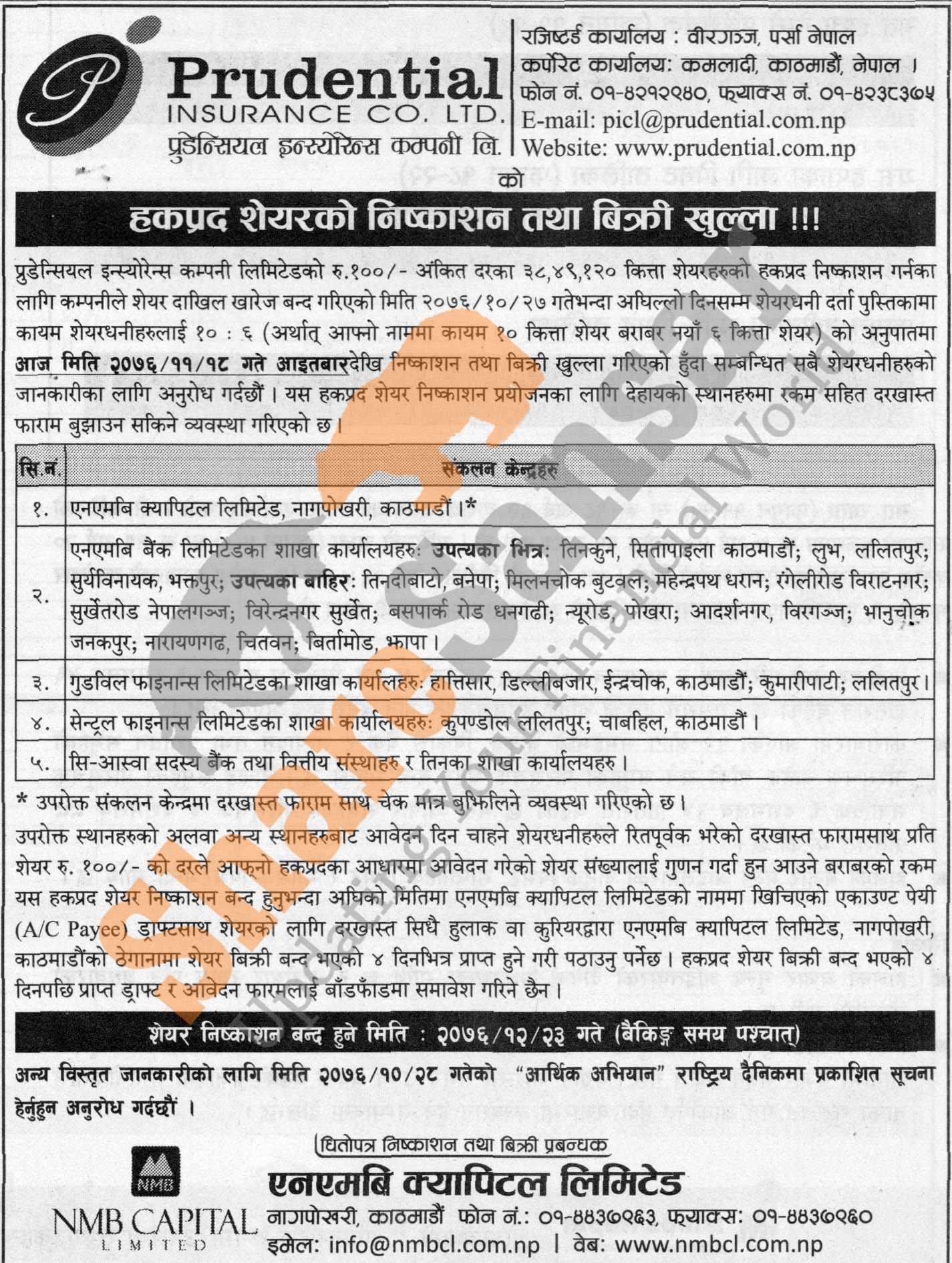 Prudential Insurance Company Limited is issuing it's 10:6 ratio 38,49,120 units right share to its shareholders from today (18th Falgun, 2076).