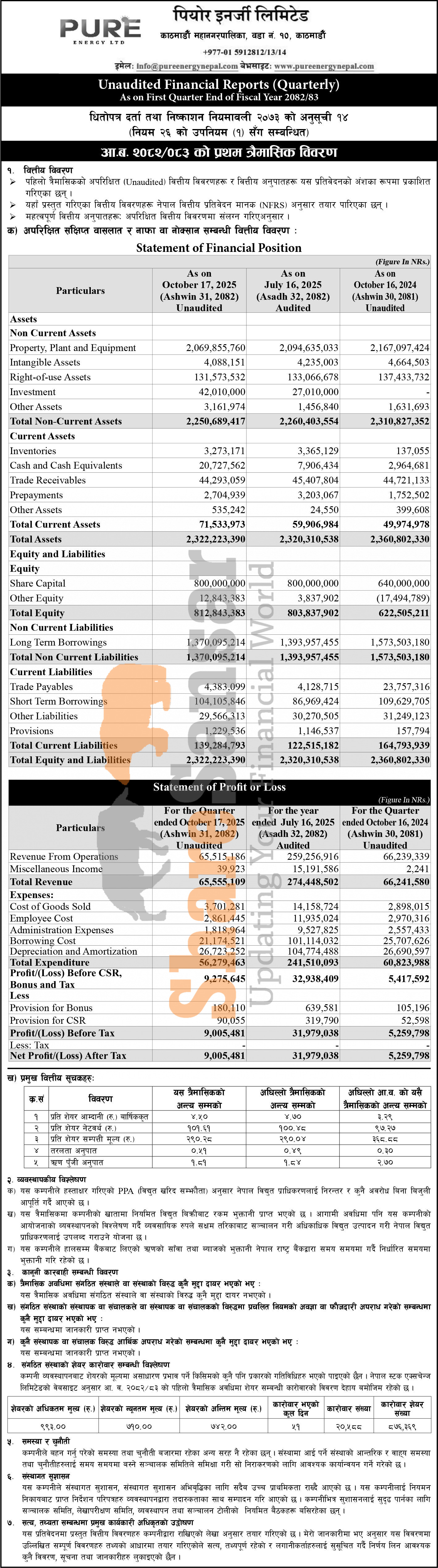 Pure Energy Limited has posted a net profit of Rs 9 million and published its 1st quarter company analysis of the fiscal year 2082/83.