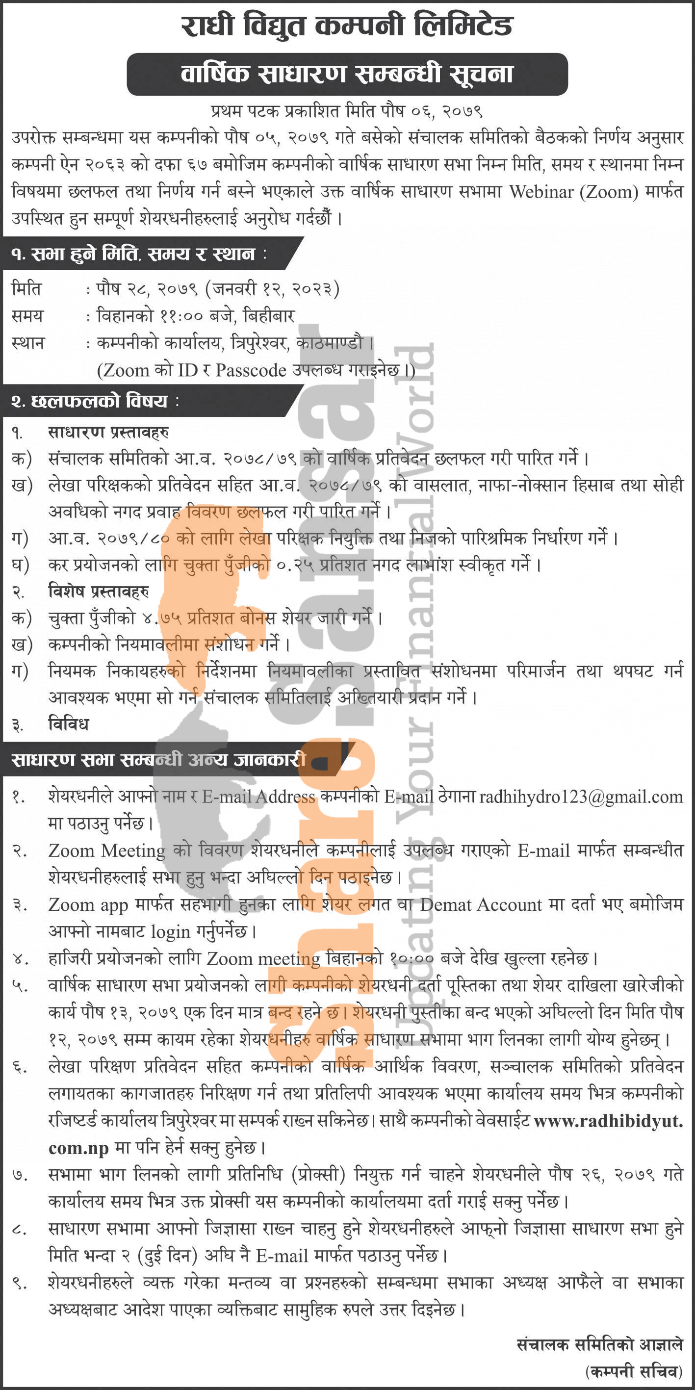 Radhi Bidyut Company Limited has announced its AGM going to be held on 28th Poush, 2079.