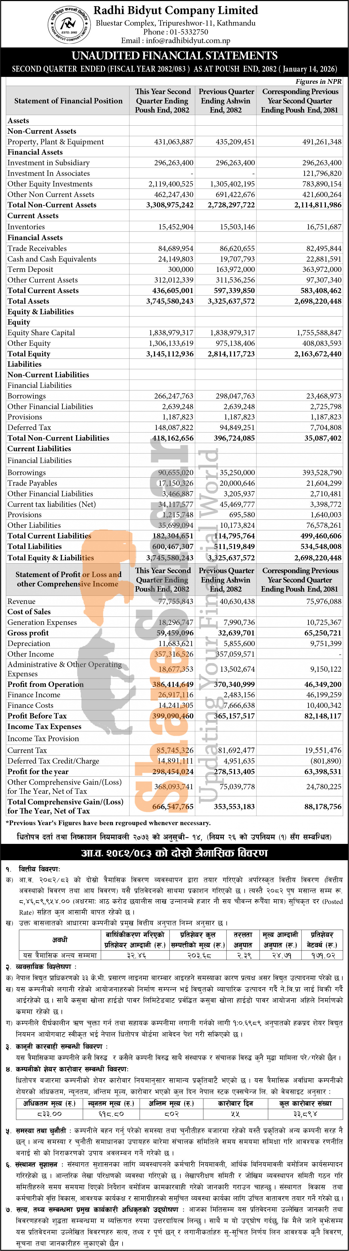 Radhi Bidyut Company Limited has posted a net profit of Rs 298.45 million and published its 2nd quarter company analysis of the fiscal year 2082/83.