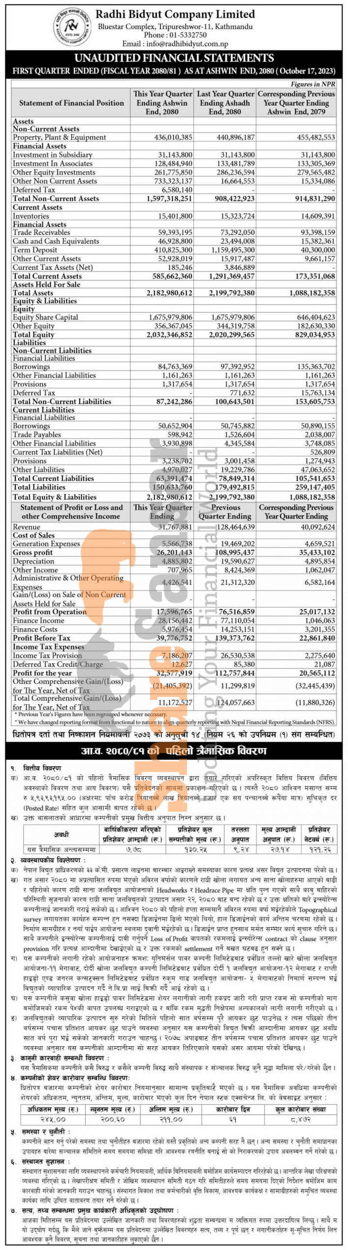 Radhi Bidyut Company Limited has posted a net profit of Rs 32.57 million and published its 1st quarter company analysis of the fiscal year 2080/81.