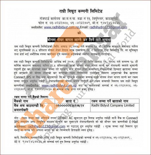 Radhi Bidyut Company Limited has urged its shareholders to pay tax amount for 36.5% bonus share distribution purposes.