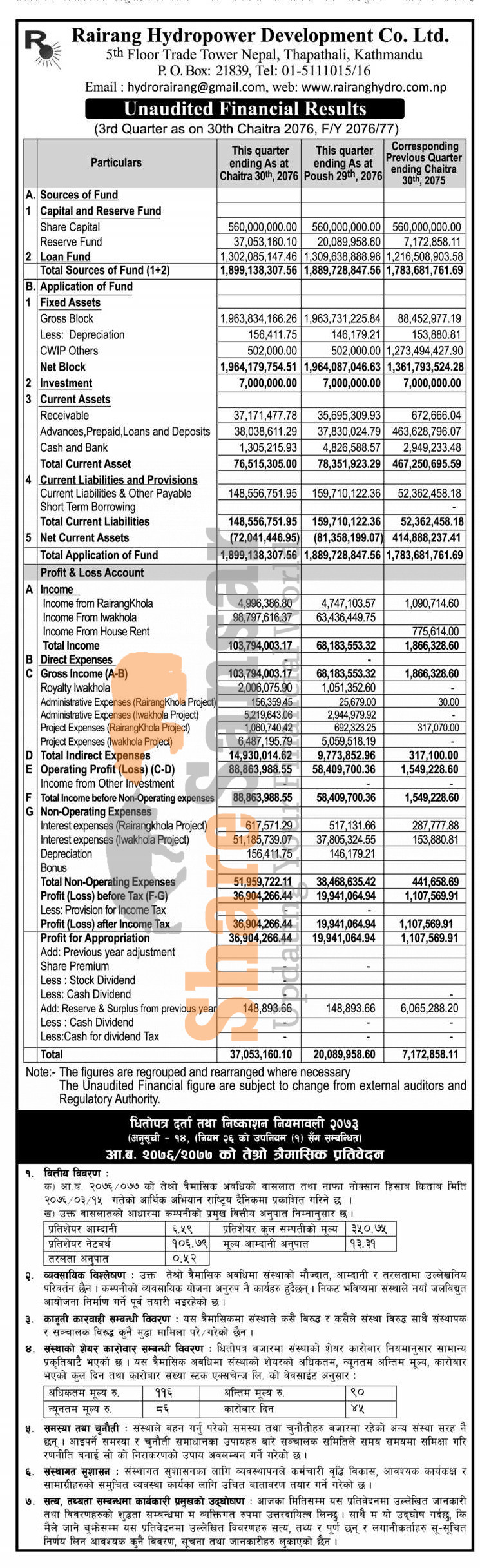 Rairang Hydropower Development Company Limited has posted a net profit of Rs 36.90 million and published its 3rd quarter company analysis of the fiscal year 2076/77.