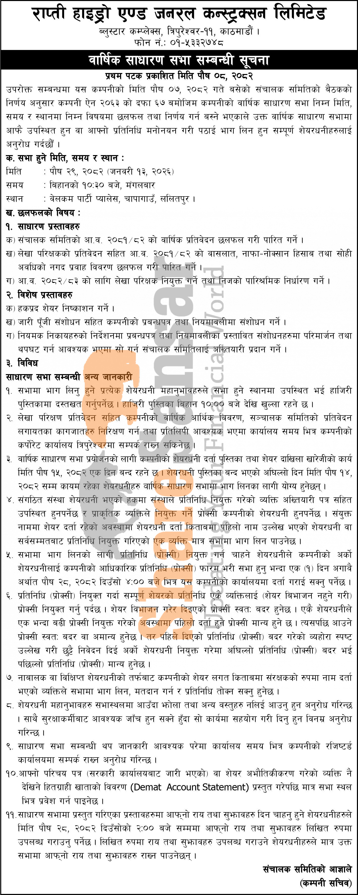Rapti Hydro & General Construction Limited has announced its AGM going to be held on 29th Poush, 2082.