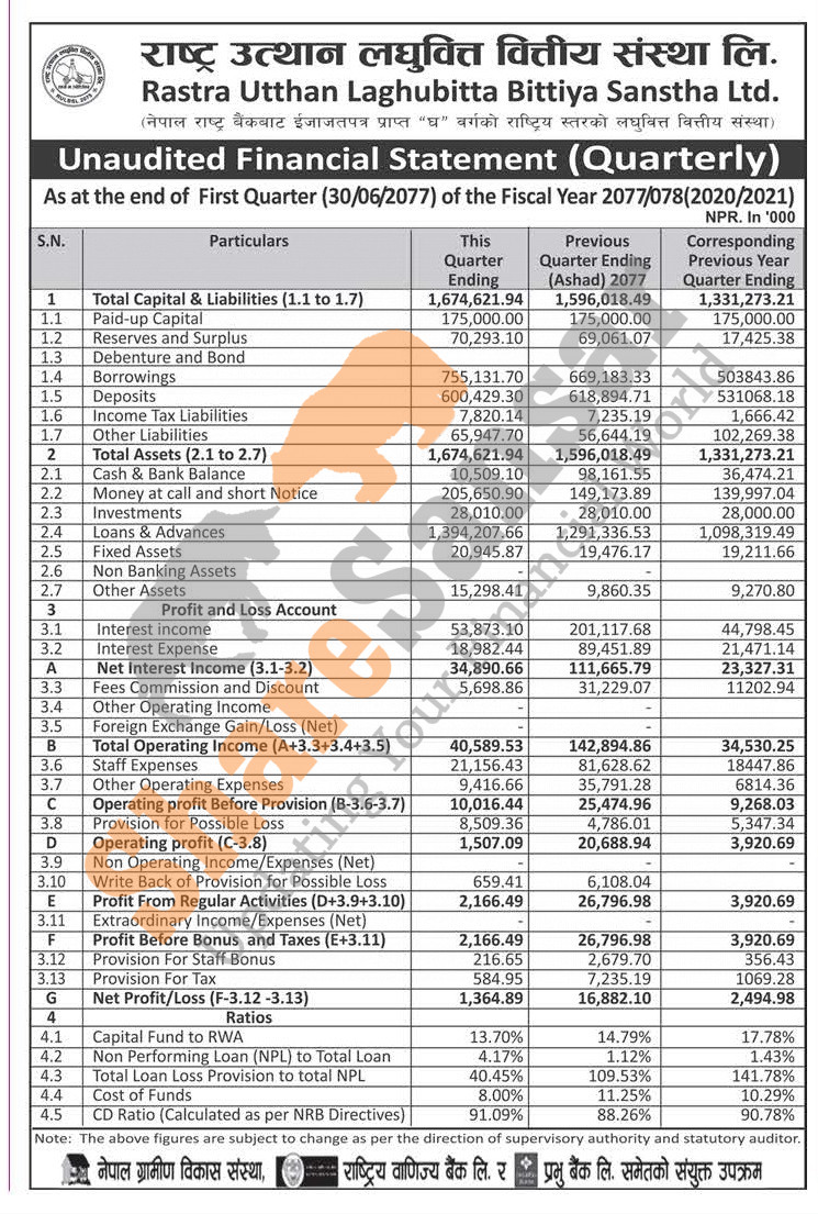 Rastra Utthan Laghubitta Bittiya Sanstha Limited has posted a net profit of Rs 1.36 million during the 1st quarter of the fiscal year 2077/78.