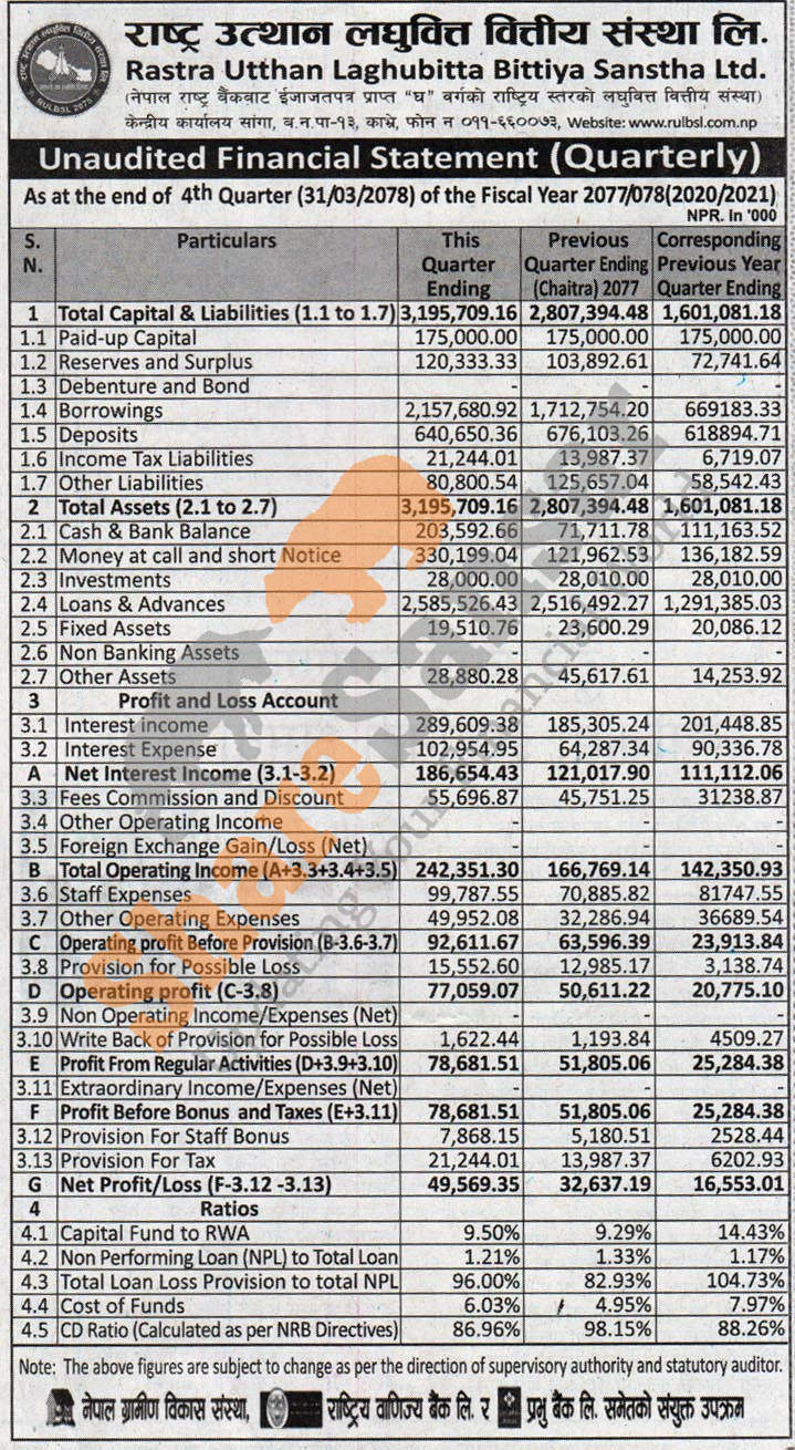 Rastra Utthan Laghubitta Bittiya Sanstha Limited has posted a net profit of Rs 49.56 million and published its 4th quarter company analysis of the fiscal year 2077/78.