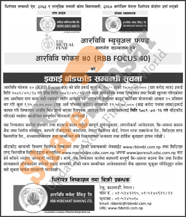 Rastriya Banijya Bank Limited has allotted its 100 million units of Rs 10 face value each mutual fund scheme "RBB Focus 40" to the general public on 26th Kartik, 2082.