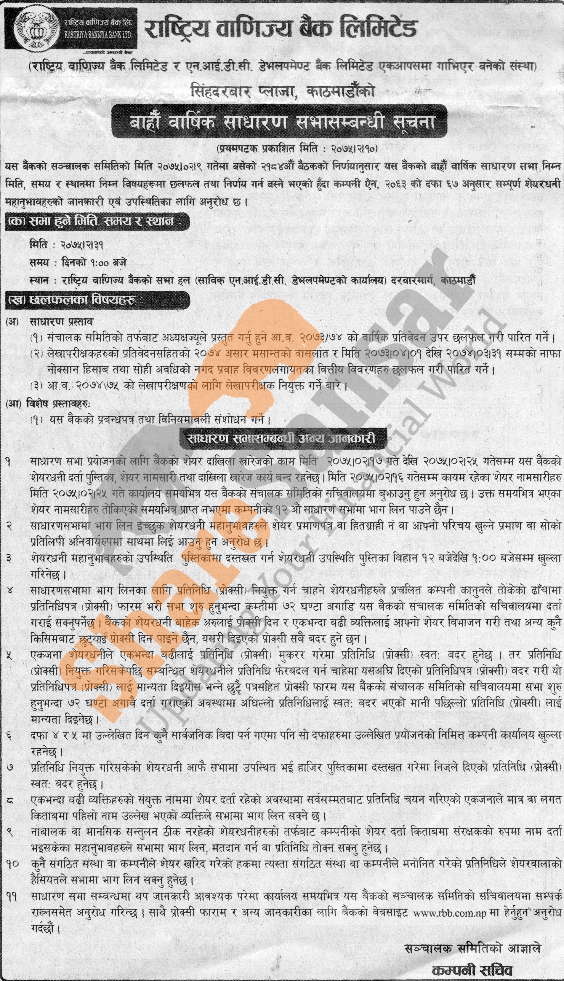 Rastriya Banijya Bank Limited has announced its 12th AGM going to be held on 31st Jestha, 2075.