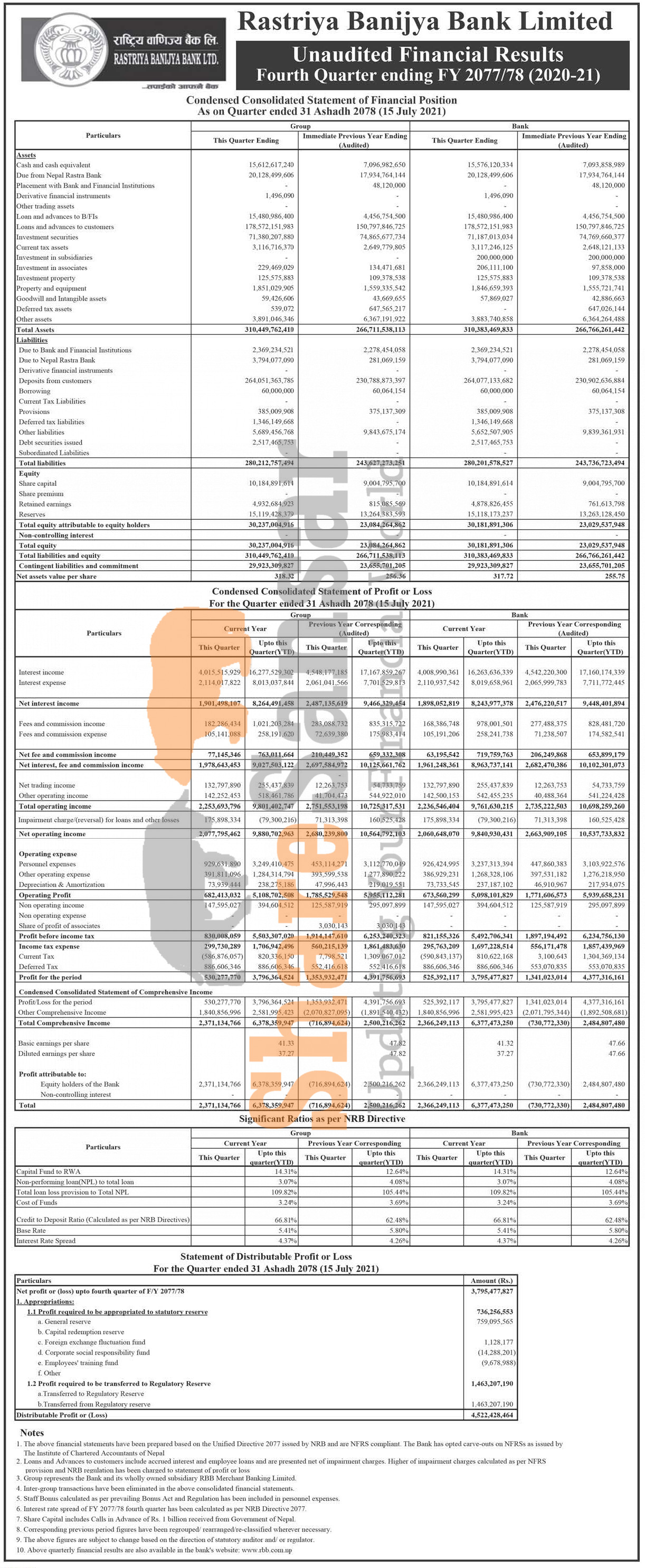 Rastriya Banijya Bank Limited has posted a net profit of Rs 3.79 billion during the 4th quarter of the fiscal year 2077/78.