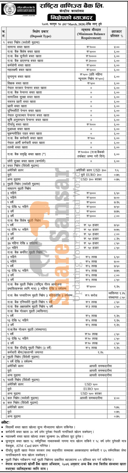 Rastriya Banijya Bank Limited has published a notice regarding new interest rate and its effective from 15th Falgun, 2076.