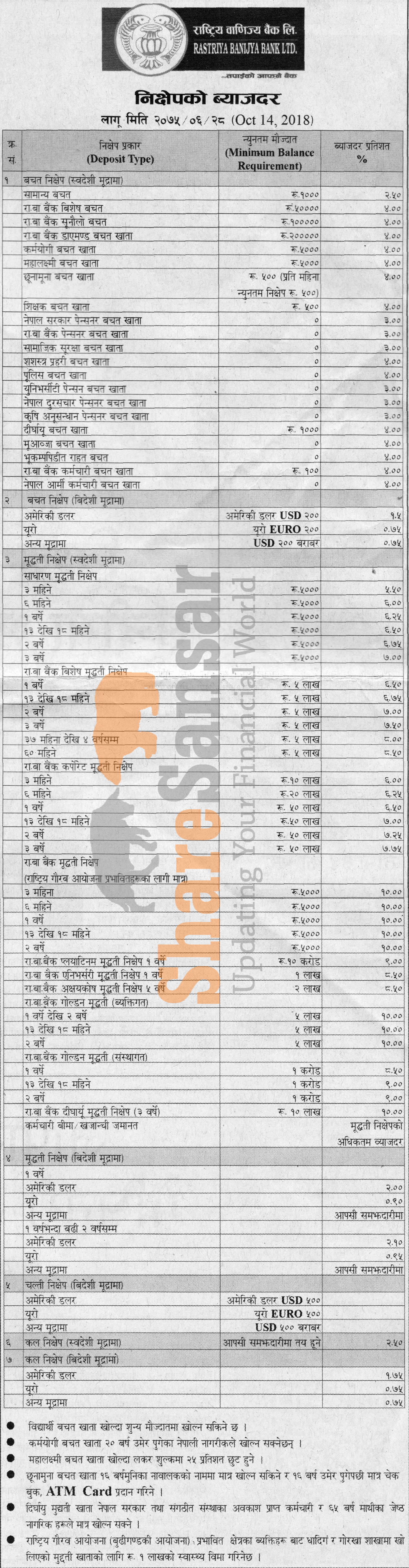 Rastriya Banijya Bank Limited has published a notice regarding new interest rate and its effective from 28th Ashwin, 2075.