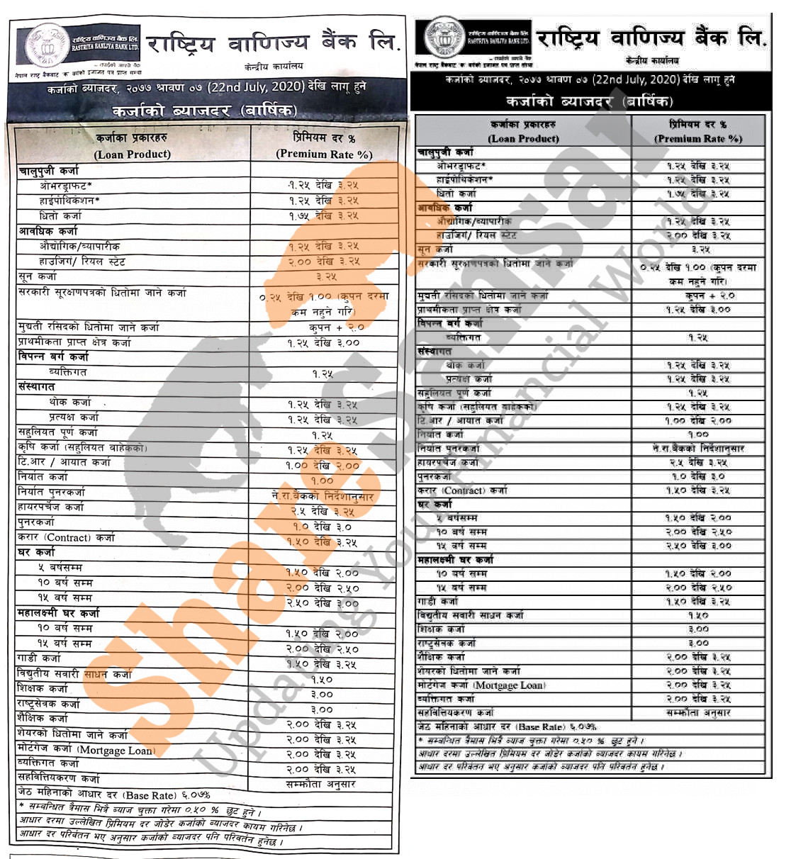 Rastriya Banijya Bank Limited has published a notice regarding the interest rate on the various deposit and loan products and its effective from 7th Shrawan, 2077.