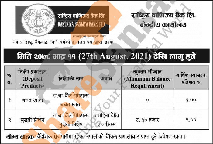 Rastriya Banijya Bank Limited has published a notice regarding the new interest rate for deposit products and it's effective from 11th Bhadra, 2078.