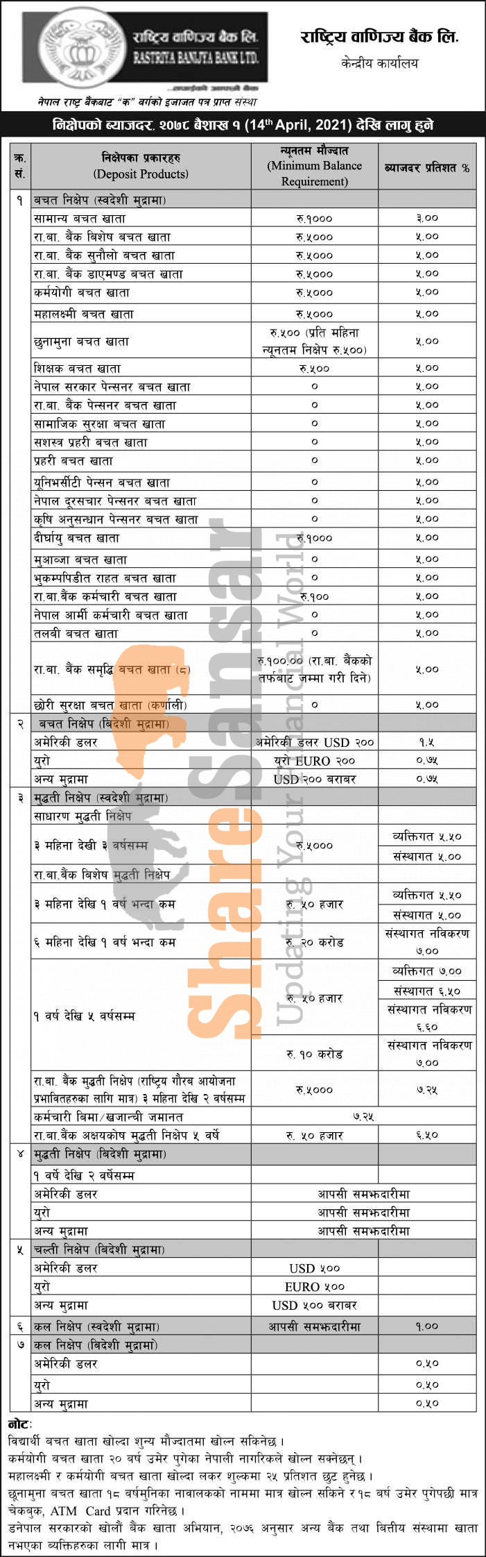 Rastriya Banijya Bank Limited has published a notice regarding the new interest rate for deposit products and it's effective from 1st Baisakh, 2078.