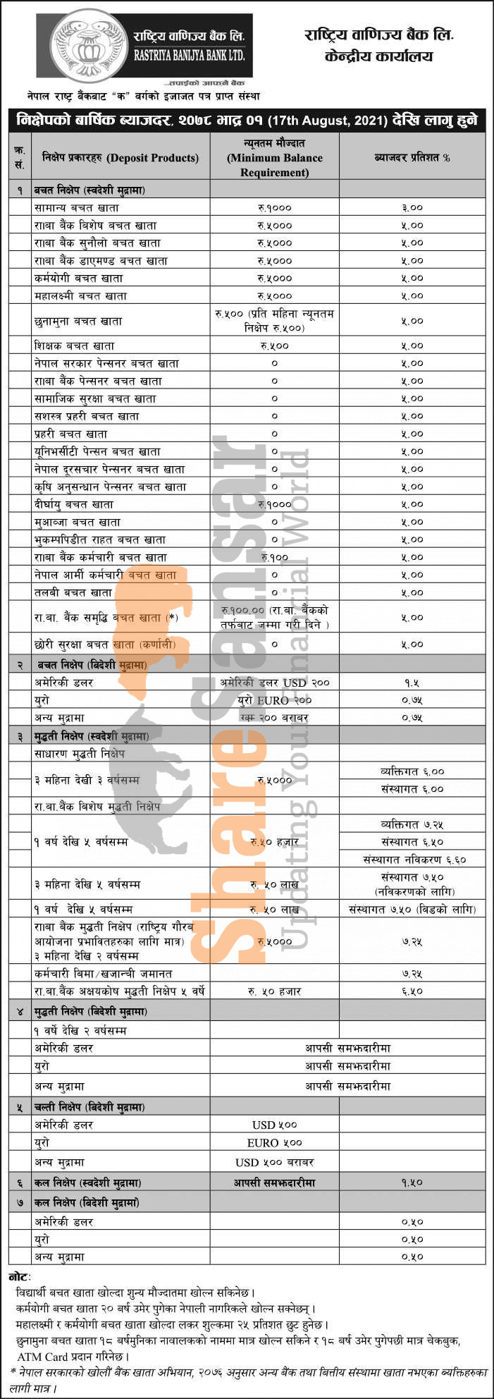 Rastriya Banijya Bank Limited has published a notice regarding the new interest rate for deposit products and it's effective from 1st Bhadra, 2078.