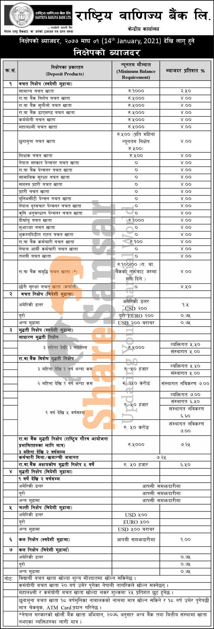 Rastriya Banijya Bank Limited has published a notice regarding the new interest rate for deposit products and it's effective from 1st Magh, 2077.