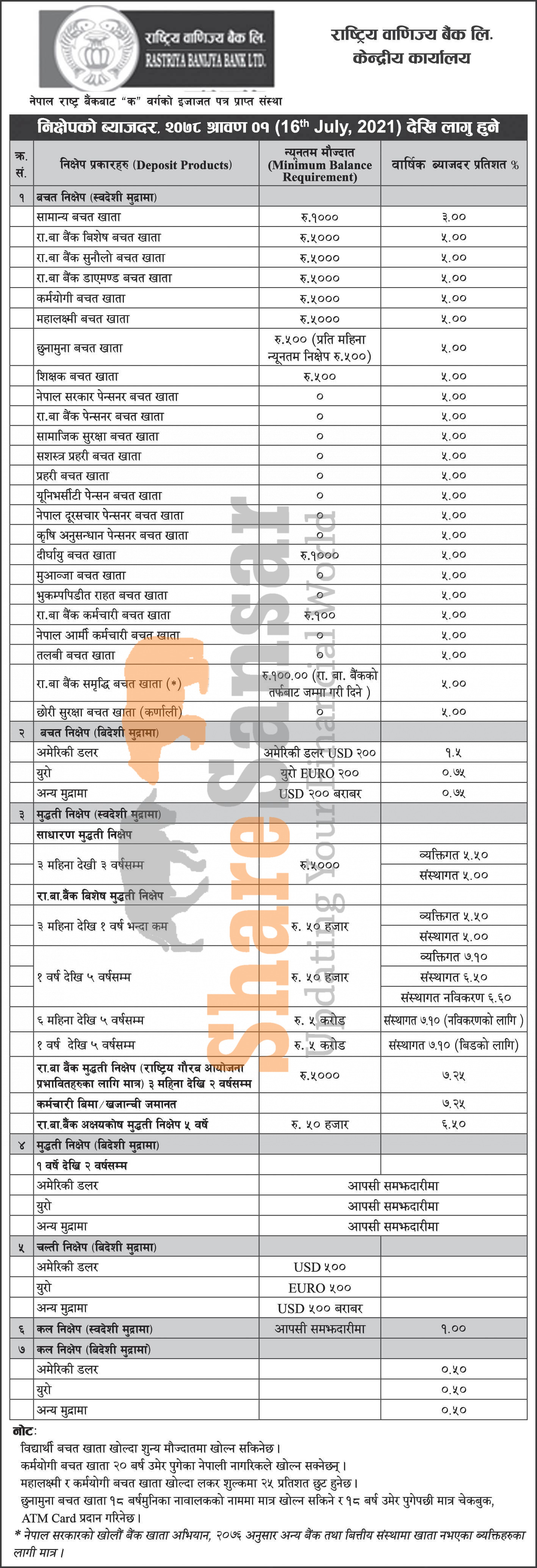 Rastriya Banijya Bank Limited has published a notice regarding the new interest rate for deposit products and it's effective from 1st Shrawan, 2078.