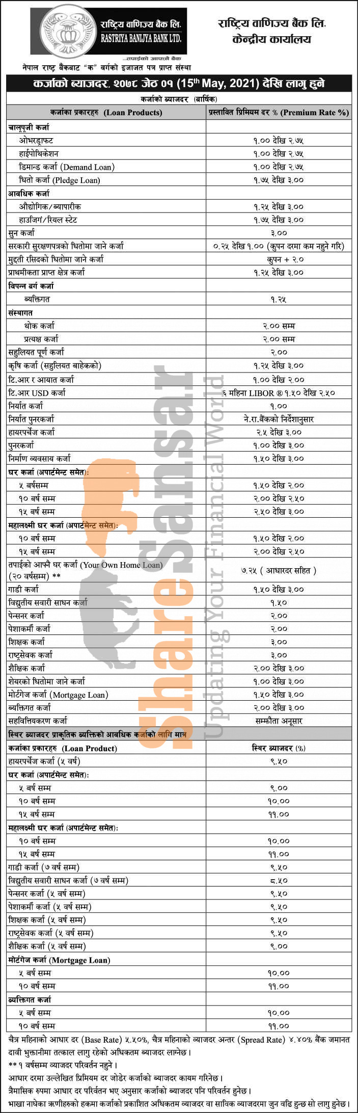 Rastriya Banijya Bank Limited has published a notice regarding the new interest rate for Loan and advances products and it's effective from 1st Jestha, 2078.