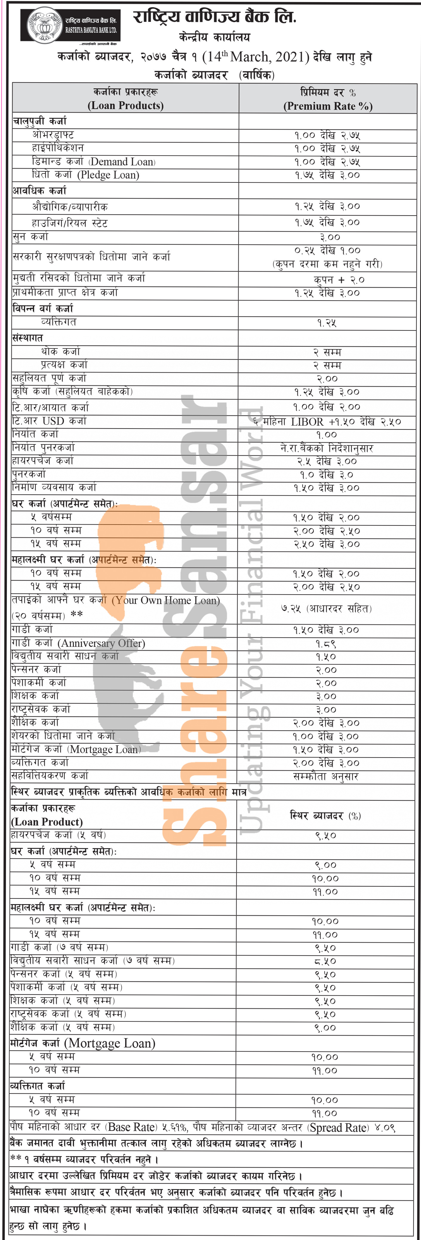 Rastriya Banijya Bank Limited has published a notice regarding the new interest rate for loan products and it's effective from 1st Chaitra, 2077.