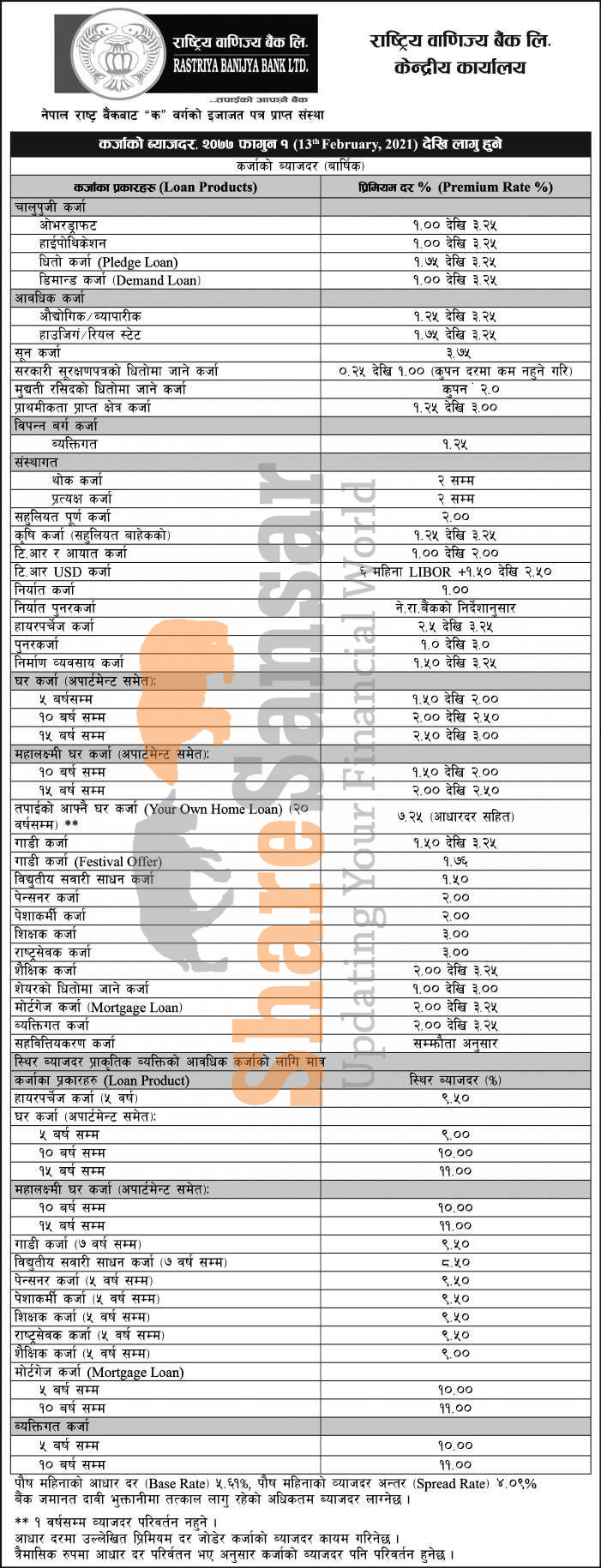Rastriya Banijya Bank Limited has published a notice regarding the new interest rate for loan products and it's effective from 1st Falgun, 2077.