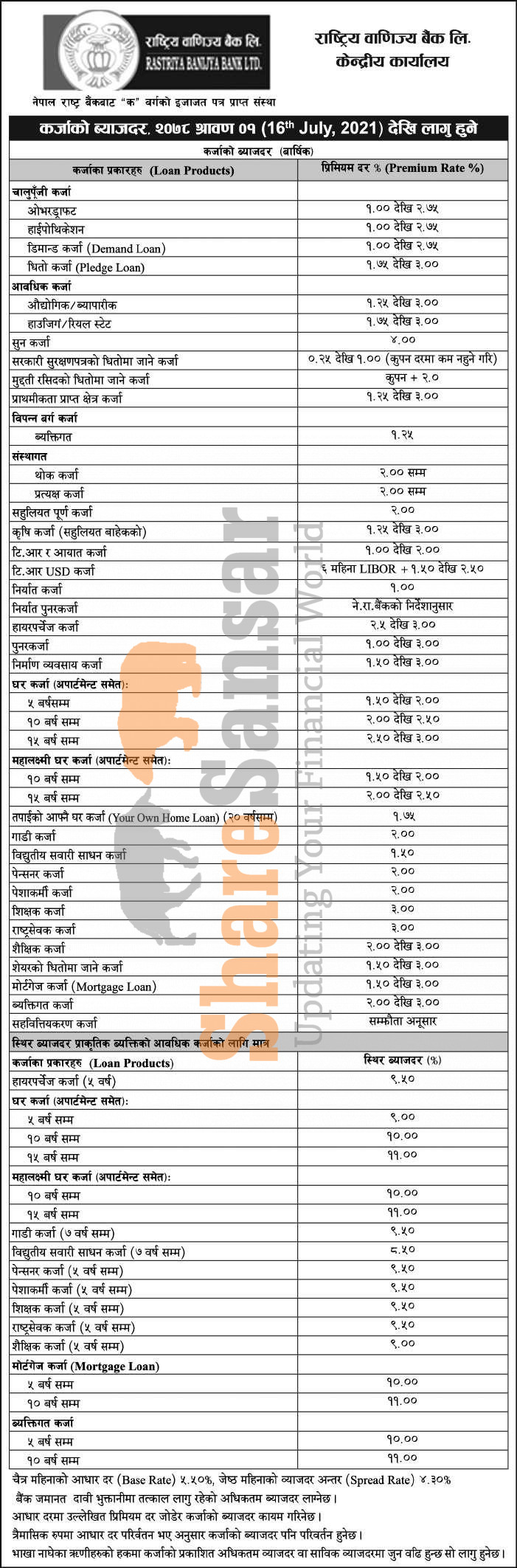 Rastriya Banijya Bank Limited has published a notice regarding the new interest rate for loan products and it's effective from 1st Shrawan, 2078.