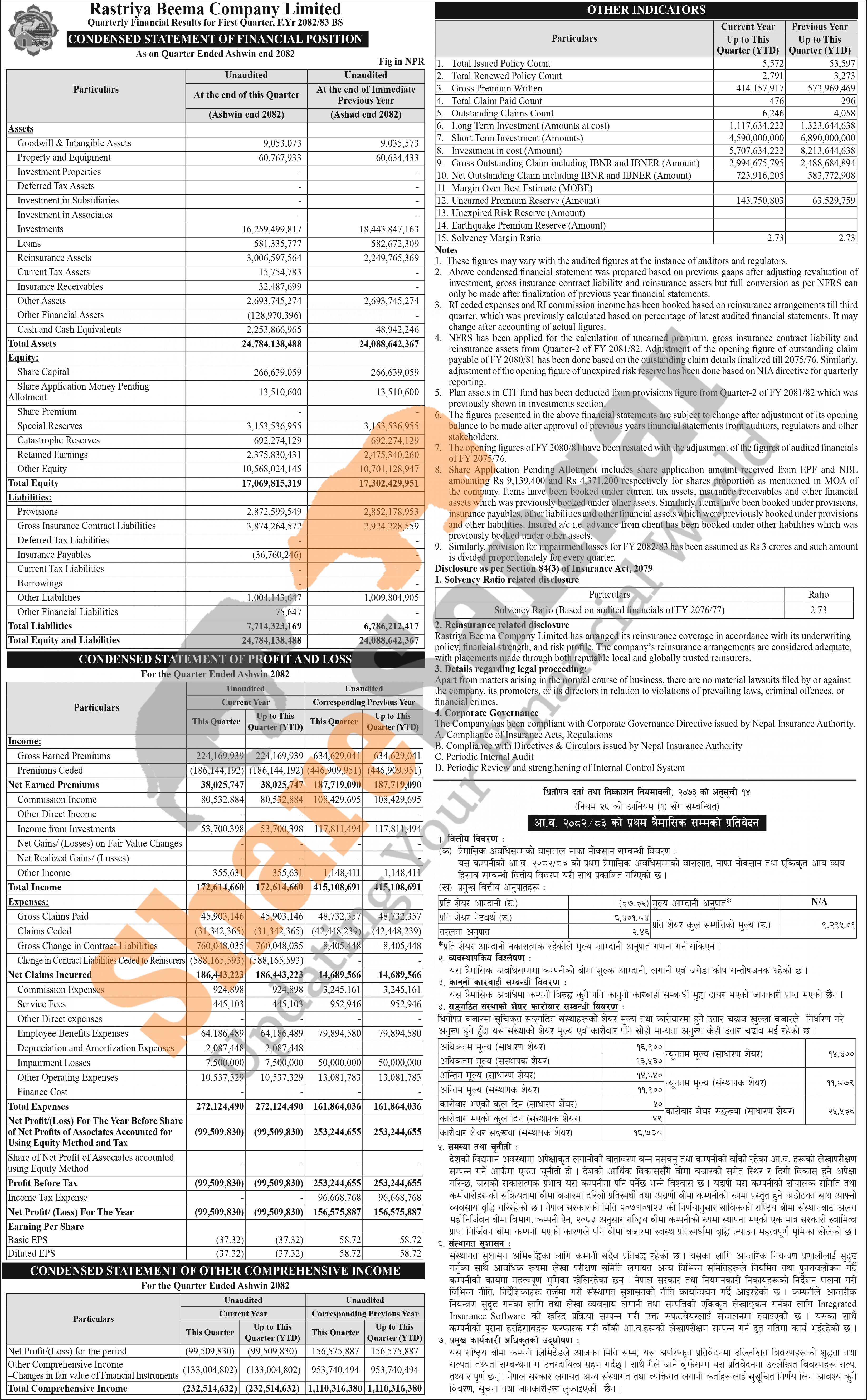 Rastriya Beema Company Limited has posted a net loss of Rs 99.50 million and published its 1st quarter company analysis of the fiscal year 2082/83.