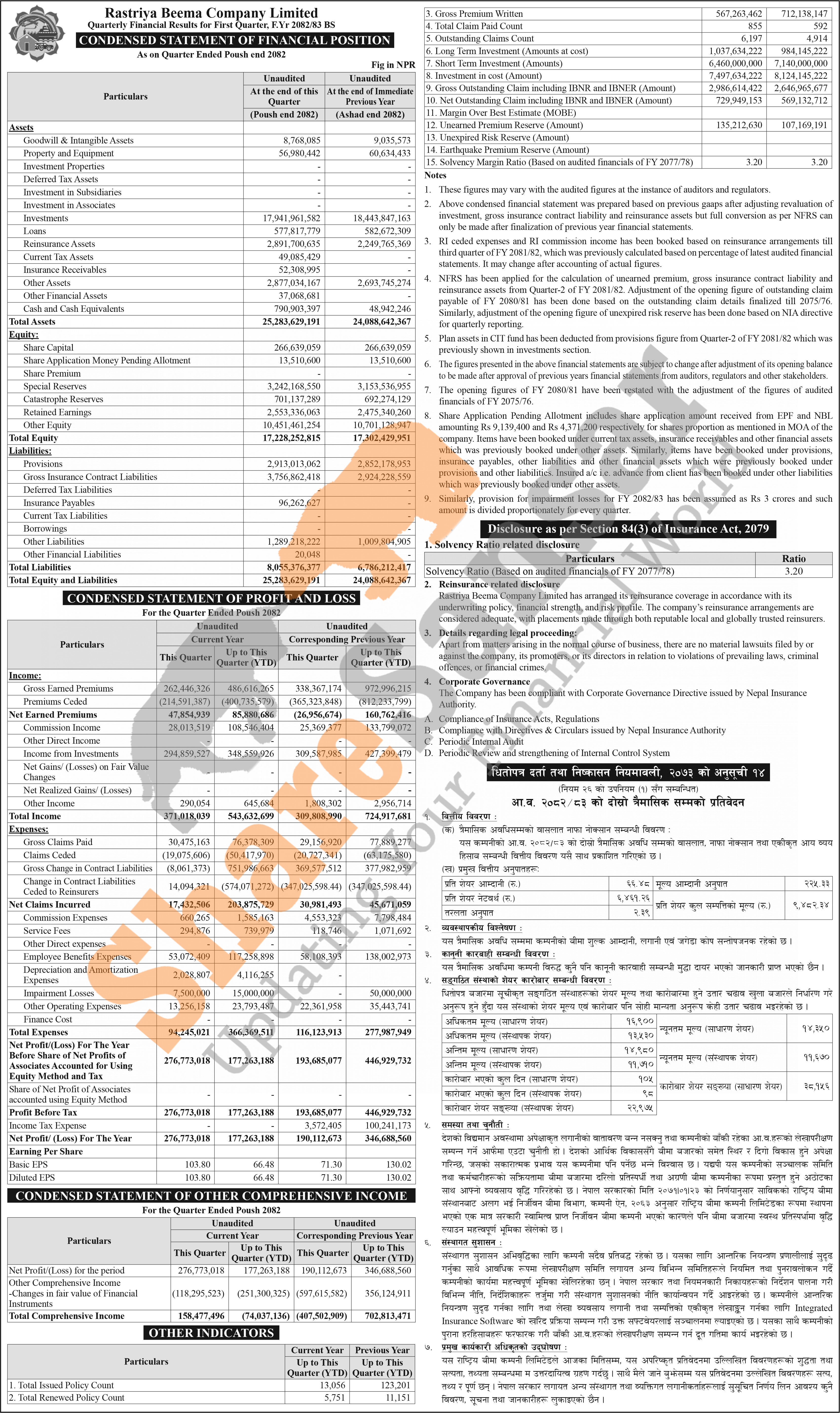 Rastriya Beema Company Limited has posted a net profit of Rs 177.26 million and published its 2nd quarter company analysis of the fiscal year 2082/83.