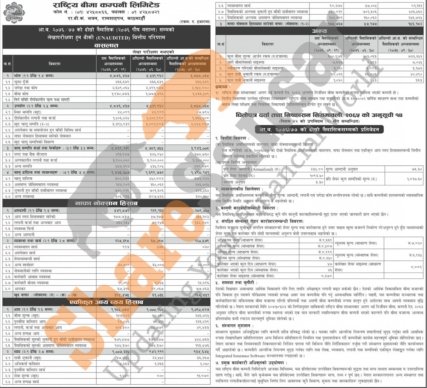 Rastriya Beema Company Limited has posted a net profit of Rs 314.47 million and published its 2nd quarter company analysis of the fiscal year 2076/77.