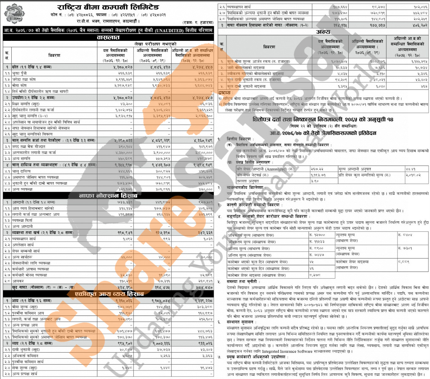 Rastriya Beema Company Limited has posted a net profit of Rs 534.39 million and published its 3rd quarter company analysis of the fiscal year 2076/77.