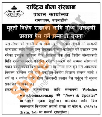 Rastriya Beema Sanstha has published a notice seeking quotation of Fixed Deposit interest.