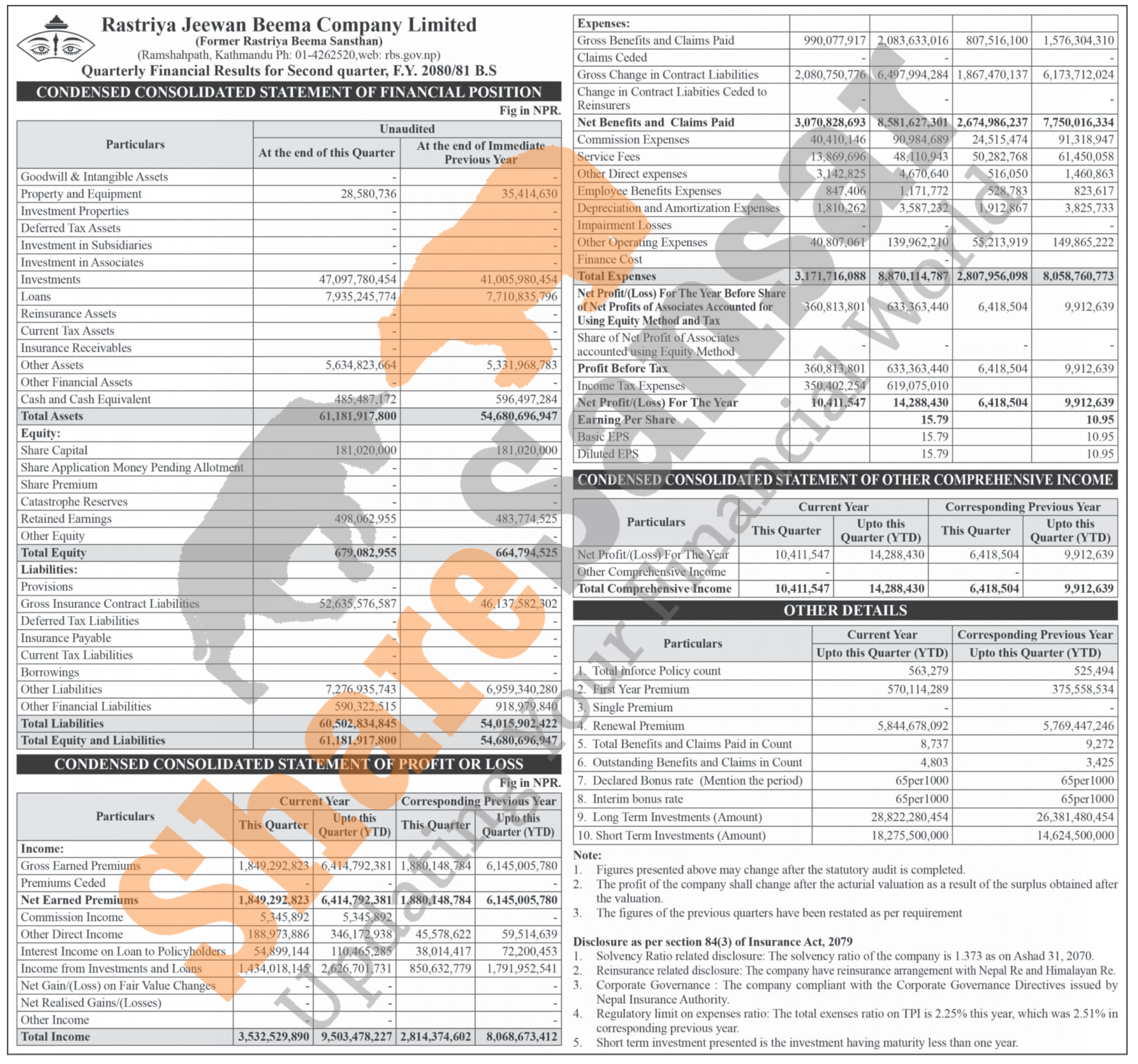 Rastriya Jeewan Beema Company Limited has posted a net profit of Rs 14.28 million and published its 2nd quarter company analysis of the fiscal year 2080/81.