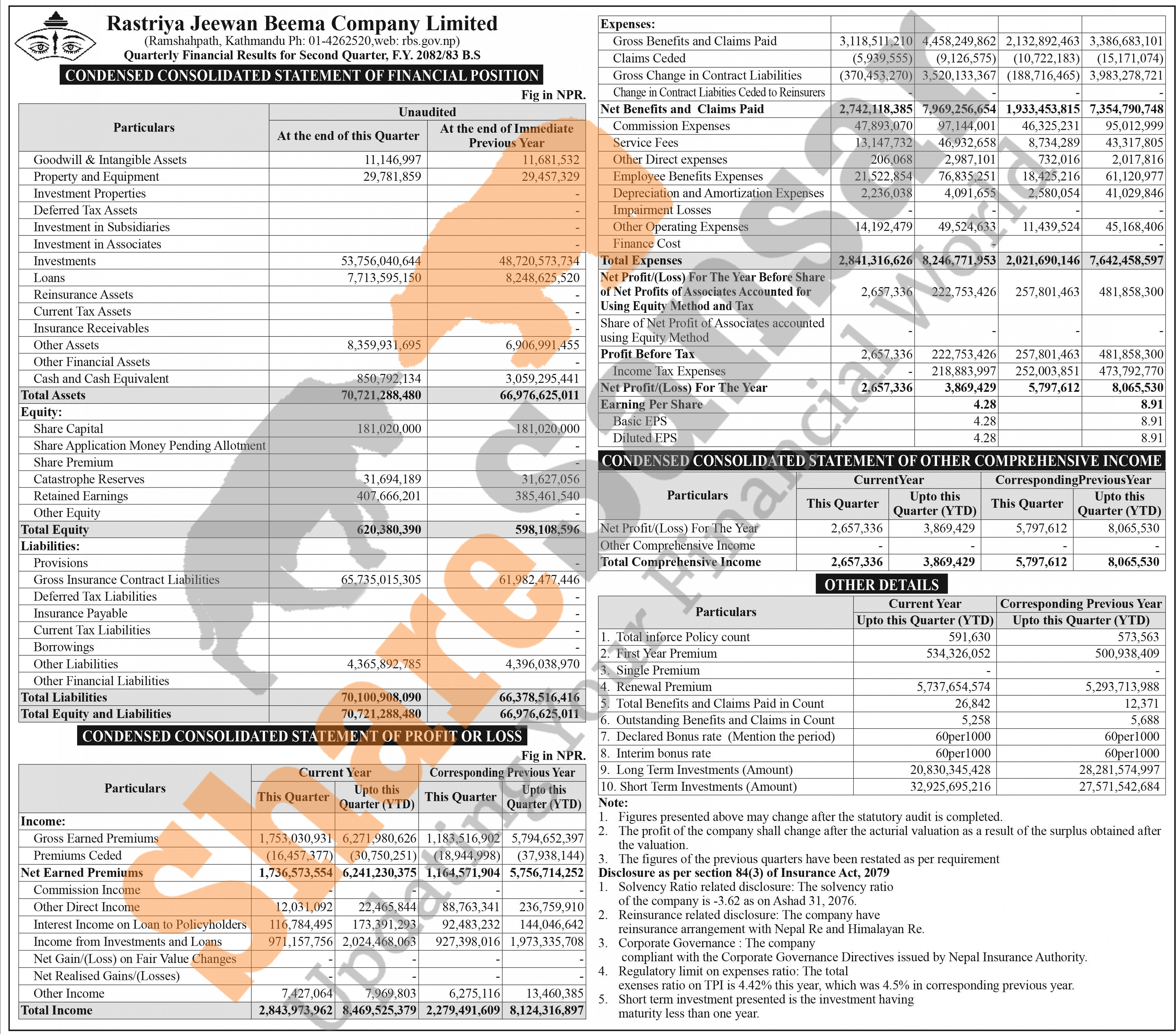 Rastriya Jeewan Beema Company Limited has posted a net profit of Rs 3.86 million and published its 2nd quarter company analysis of the fiscal year 2082/83.
