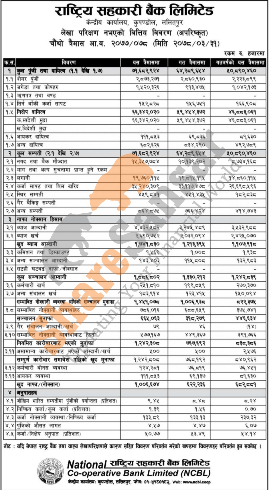 Rastriya Sahakari Bank Limited has posted a net profit of Rs 1.006 billion and published its 4th quarter company analysis of the fiscal year 2077/78.