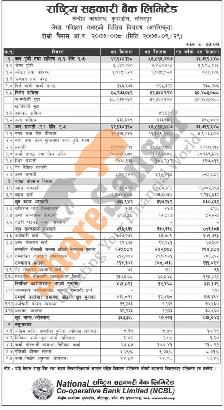 Rastriya Sahakari Bank Limited has posted a net profit of Rs 353.36 million and published its 2nd quarter company analysis of the fiscal year 2077/78.