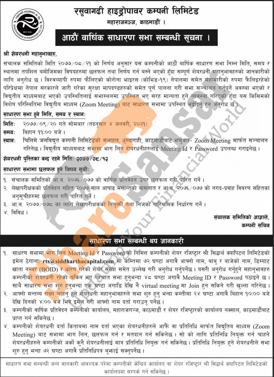 Rasuwagadhi Hydropower Company Limited has announced its 8th AGM going to be held on 20th Poush, 2077.