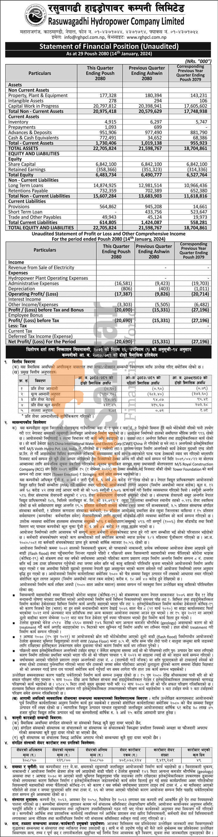 Rasuwagadhi Hydropower Company Limited has posted a net loss of Rs 20.69 million and published its 2nd quarter company analysis of the fiscal year 2080/81.