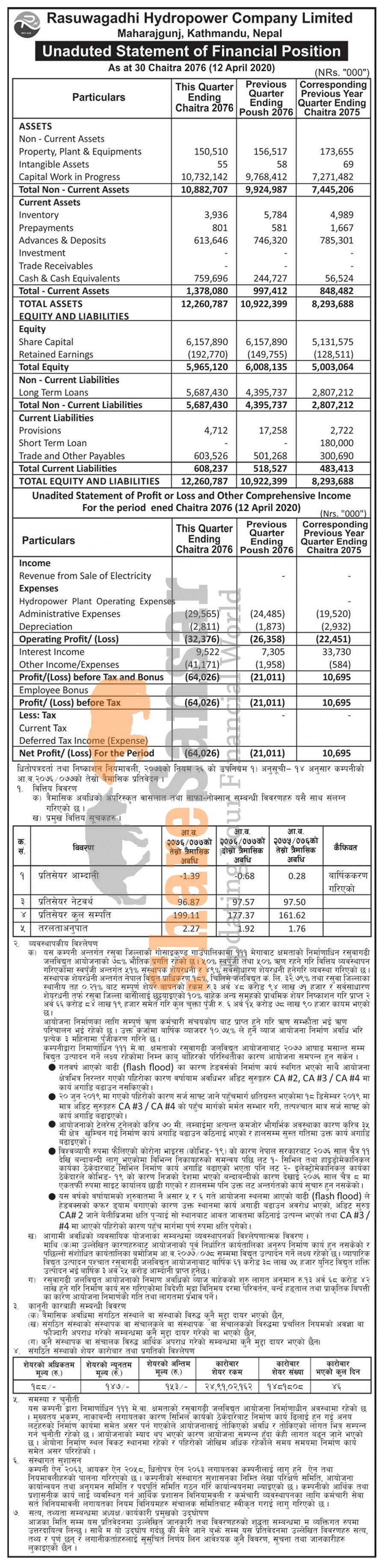 Rasuwagadhi Hydropower Company Limited has posted a net loss of Rs 64.02 million and published its 3rd quarter company analysis of the fiscal year 2076/77.