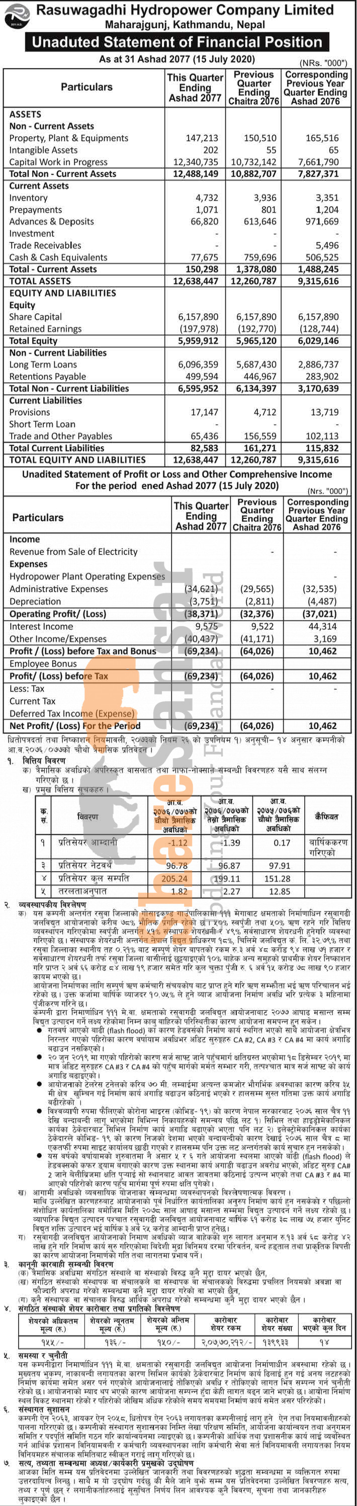 Rasuwagadhi Hydropower Company Limited has posted a net loss of Rs 69.23 million and published its 4th quarter company analysis of the fiscal year 2076/77.