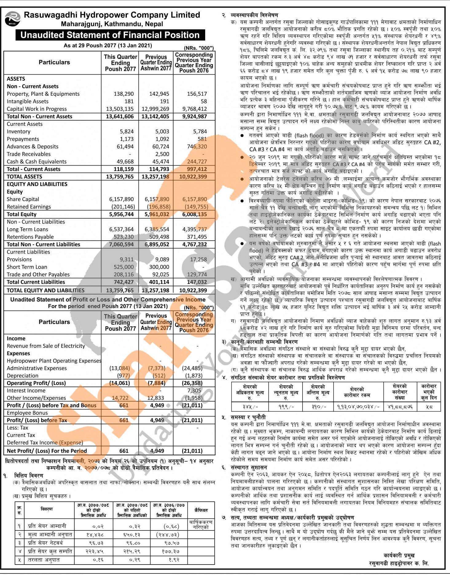 Rasuwagadhi Hydropower Company Limited has posted a net profit of Rs 0.66 million and published its 2nd quarter company analysis of the fiscal year 2077/78.