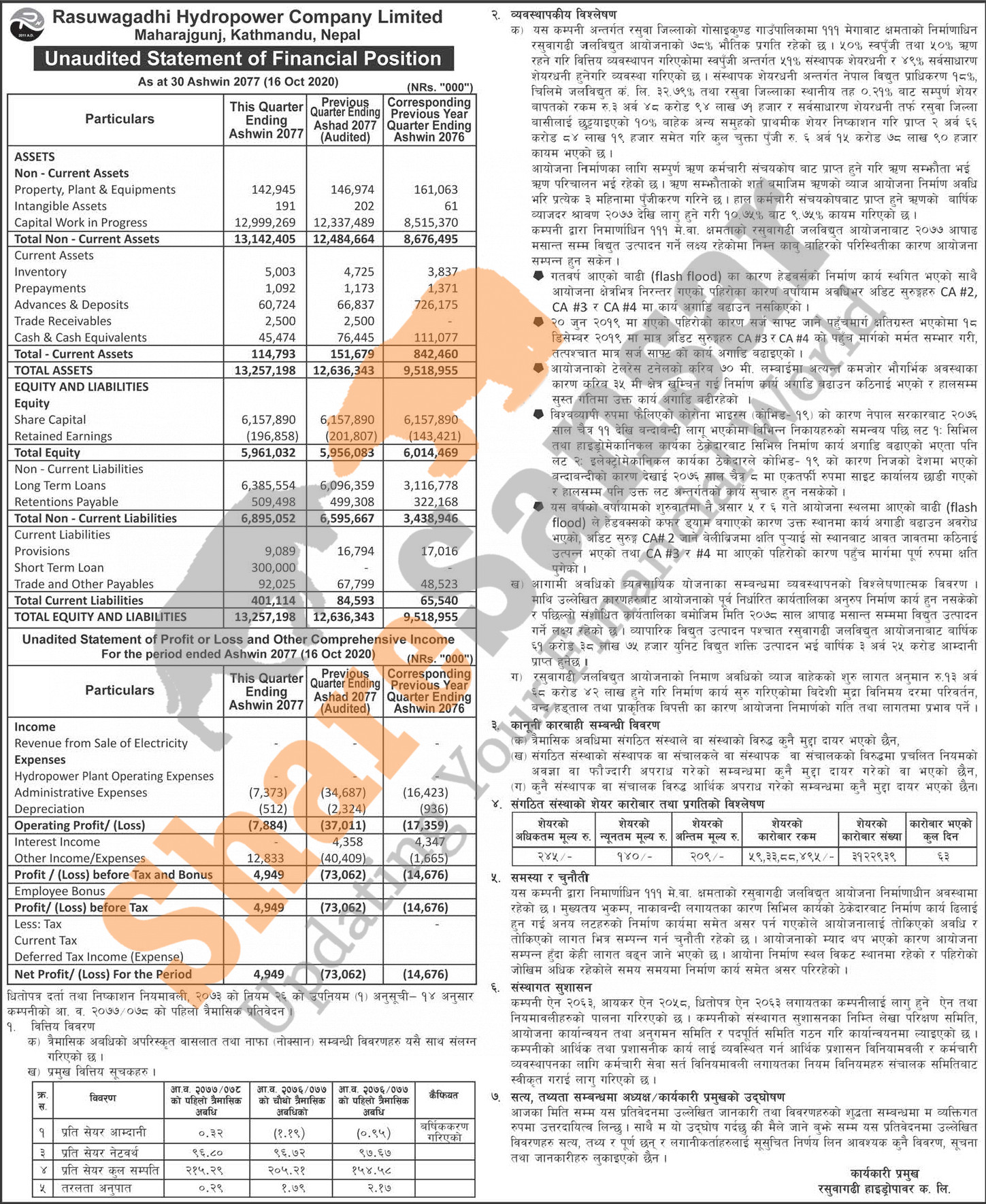 Rasuwagadhi Hydropower Company Limited has posted a net profit of Rs 4.94 million and published its 1st quarter company analysis of the fiscal year 2077/78.