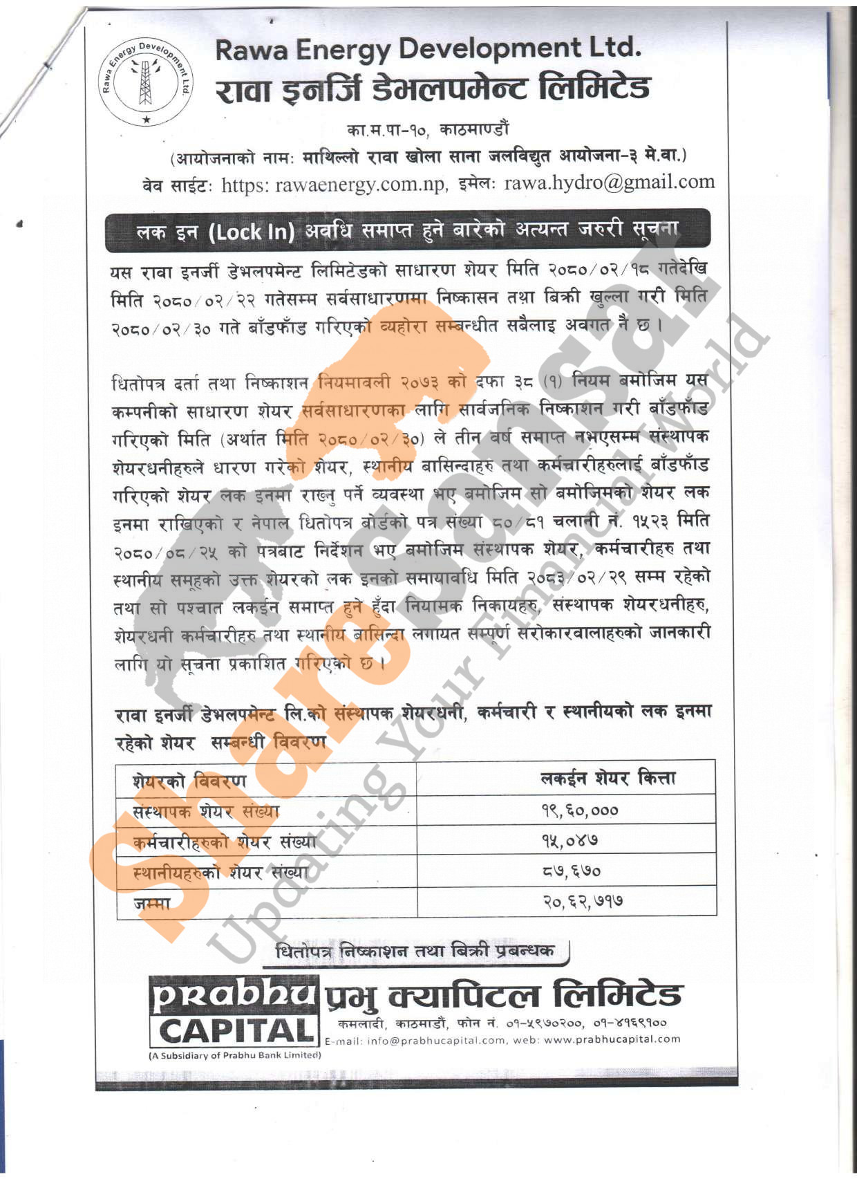 Rawa Energy Development Limited has published a notice regarding the expiration of the lock-in period for its promoters, local residents of the project affected area and employee shares on 29th Jestha, 2083.