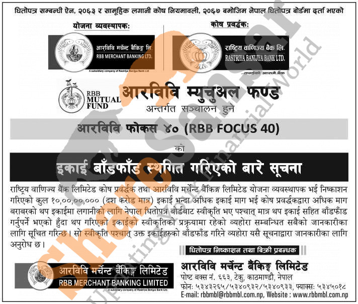 RBB Merchant Banking Limited has published a notice regarding the suspension of allotment of "RBB Focus 40" and the allotment process will happen only after the approval from the Securities Board of Nepal (SEBON).