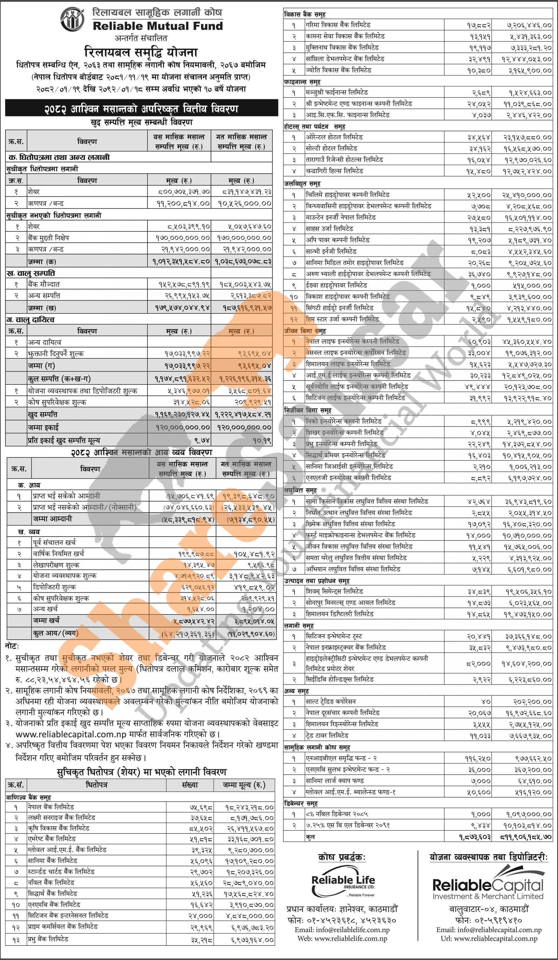 Reliable Investment and Merchant Capital Limited has published "Reliable Samriddhi Yojana" Net Assets Value (NAV) till Ashwin, 2082.