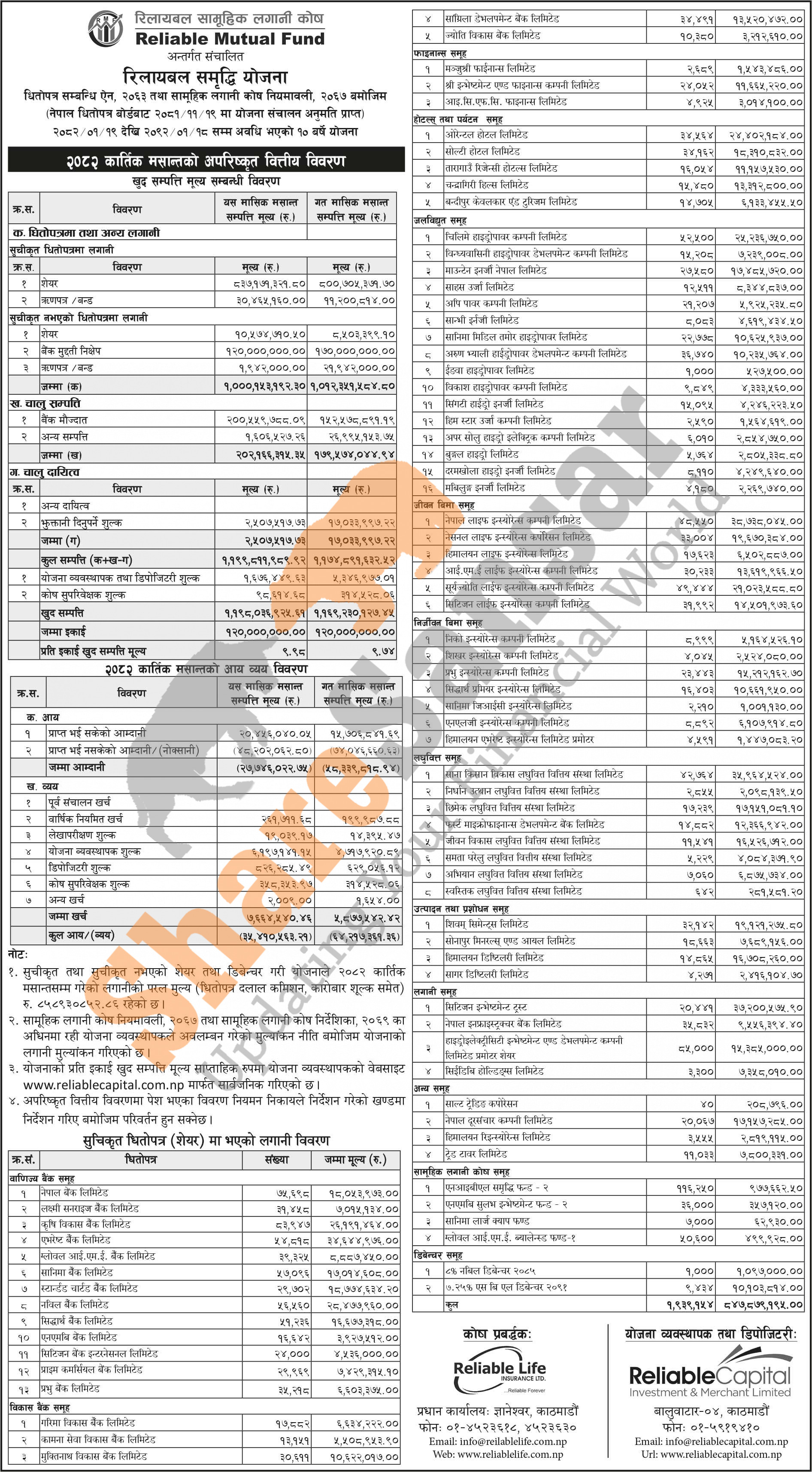 Reliable Investment and Merchant Capital Limited has published "Reliable Samriddhi Yojana" Net Assets Value (NAV) till Kartik, 2082.