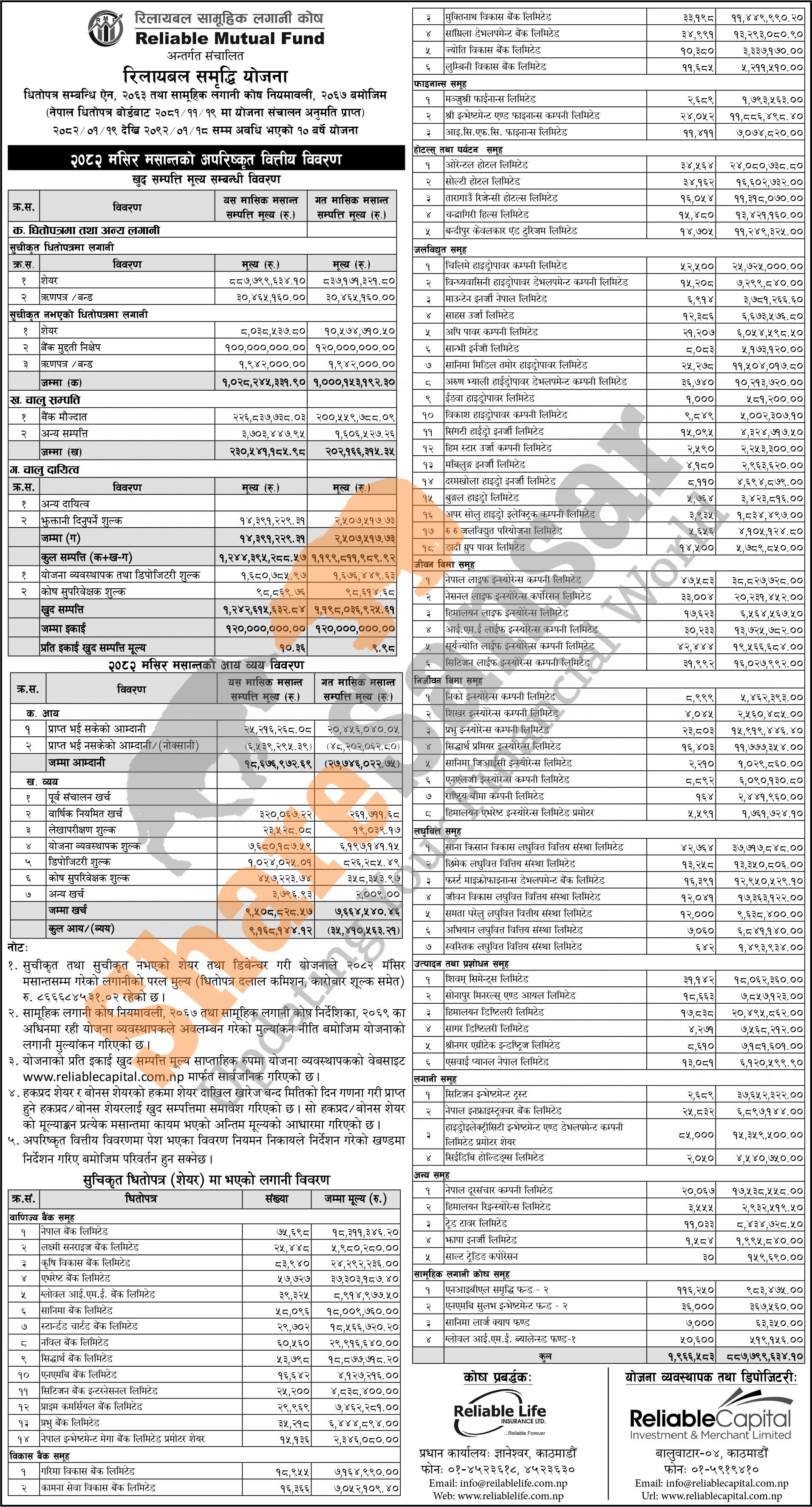 Reliable Investment and Merchant Capital Limited has published "Reliable Samriddhi Yojana" Net Assets Value (NAV) till Mangsir, 2082.