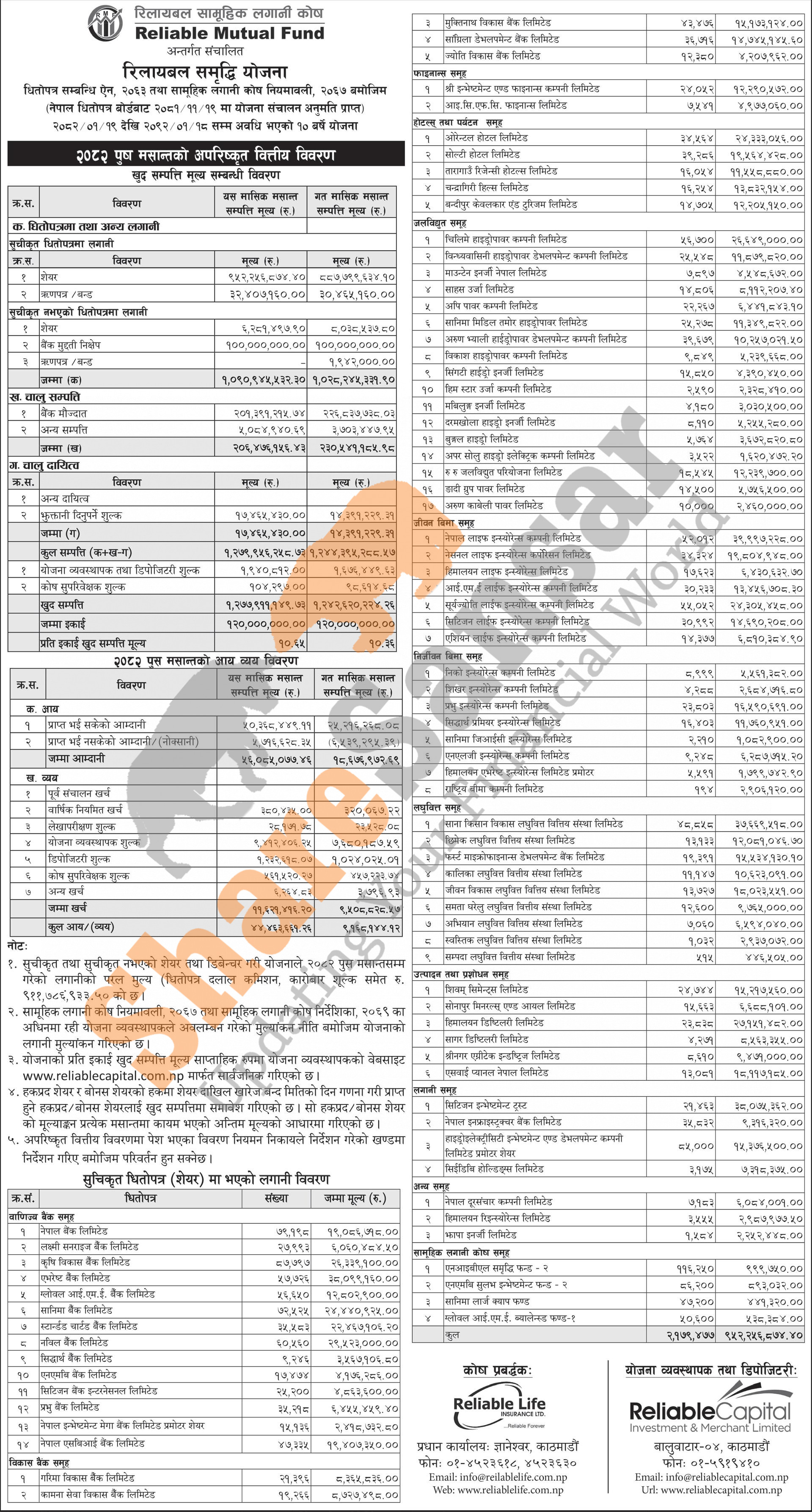 Reliable Investment and Merchant Capital Limited has published "Reliable Samriddhi Yojana" Net Assets Value (NAV) till Poush, 2082.