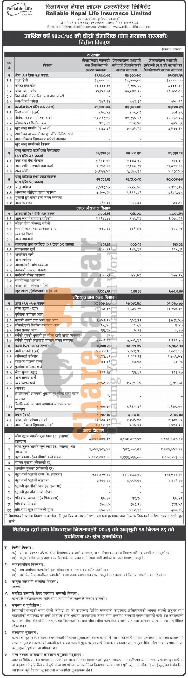 Reliable Nepal Life Insurance Limited has posted a net profit of Rs 180.51 million during the 2nd quarter of the fiscal year 2078/79.