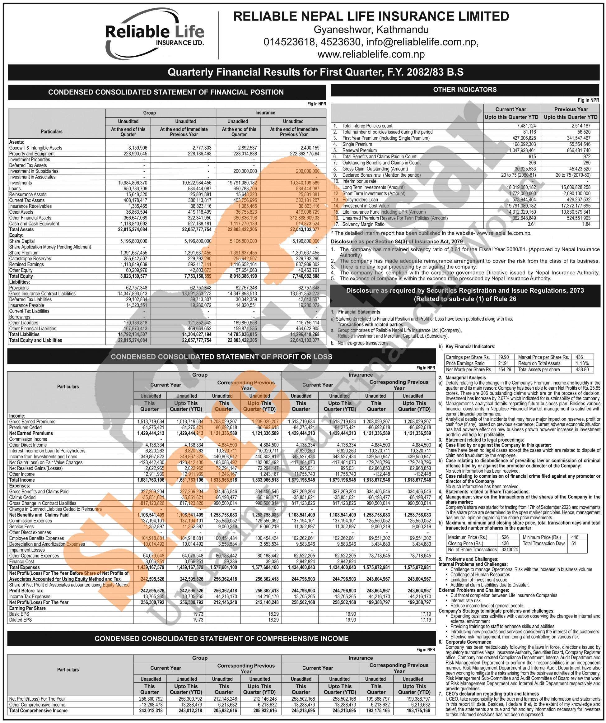 Reliable Nepal Life Insurance Limited has posted a net profit of Rs 258.50 million and published its 1st quarter company analysis of the fiscal year 2082/83.