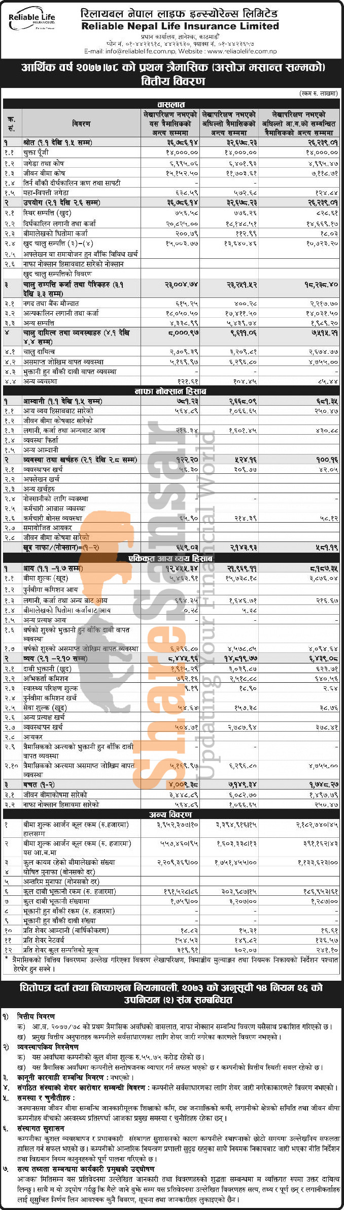 Reliable Nepal Life Insurance Limited has posted a net profit of Rs 65.9 million and published its 1st quarter company analysis of the fiscal year 2077/78.