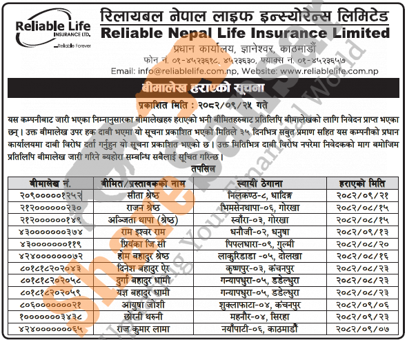 Reliable Nepal Life Insurance Limited has published a notice regarding a claim for lost share certificates.